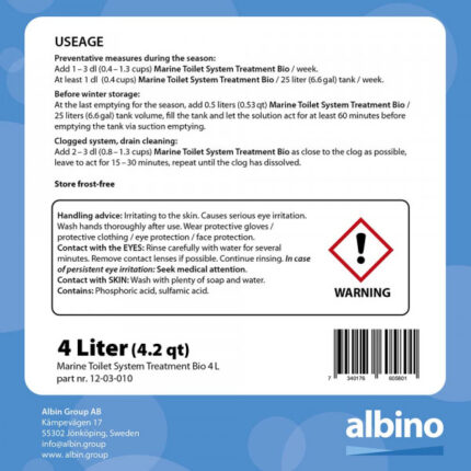 4 لتر (1.1 جالون أمريكي) من سائل خزان الصرف الصحي لمراحيض القوارب. يمنع ويقلل من الروائح. قابل للتحلل البيولوجي. تم تطوير Marine Toilet Fresh Aura Liquid Bio خصيصًا لتقليل الروائح الصادرة من خزان الصرف الصحي في القوارب الترفيهية. • تم تطويره للقوارب، ولكنه مناسب أيضًا للبيوت الصيفية والبيوت المتنقلة والقوافل • سائل خاص صديق للبيئة ينظف ويمنع ويقلل من الروائح الكريهة في الأنظمة الصحية • رائحة خفيفة وممتعة • قابل للتحلل البيولوجي • لن يضر بالمعادن أو البلاستيك أو المطاط الاستخدام لمنع الروائح الكريهة من المرحاض. جميع الاستخدامات الأخرى ممنوعة. الجرعة: أضف 1 ديسيلتر (0.4 كوب) من Marine Toilet Fresh Aura Liquid Bio لكل 2 لتر (2.2 كوارت أمريكي) من الماء إلى الخزان الفارغ. أضف 1 ديسيلتر (0.4 كوب) في كل مرة، عند الحاجة. يُحفظ بعيدًا عن الصقيع. خطر! نصائح التعامل: مُهيّج للجلد. يُسبب تهيجًا شديدًا للعينين. اغسل يديك جيدًا بعد الاستخدام. ارتدِ قفازات واقية / ملابس واقية / واقيًا للعينين / واقيًا للوجه. في حالة ملامسة العينين: اشطفهما جيدًا بالماء لعدة دقائق. انزع العدسات اللاصقة إن أمكن. استمر في الشطف. اتصل فورًا بمركز مكافحة السموم أو الطبيب. في حالة ملامسة الجلد: اغسل جيدًا بالماء والصابون. يحتوي على: كلوريد ألكيل (C12-16) ثنائي ميثيل بنزيل الأمونيوم.