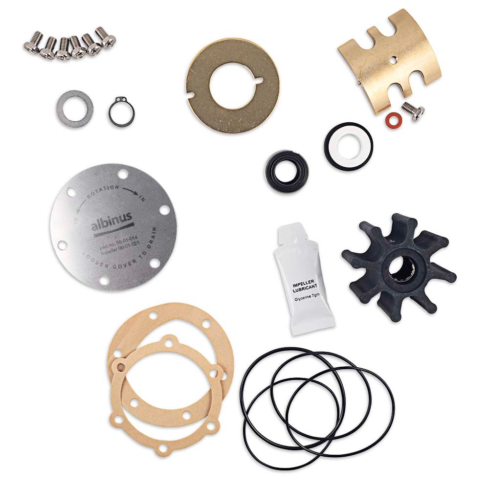 طقم صيانة لمضخة PN 05-01-014. يشمل طقم استبدال المروحة كما هو موضح في الصورة، وقطع الغيار، وأدوات التثبيت لمضخة FIP هذه.