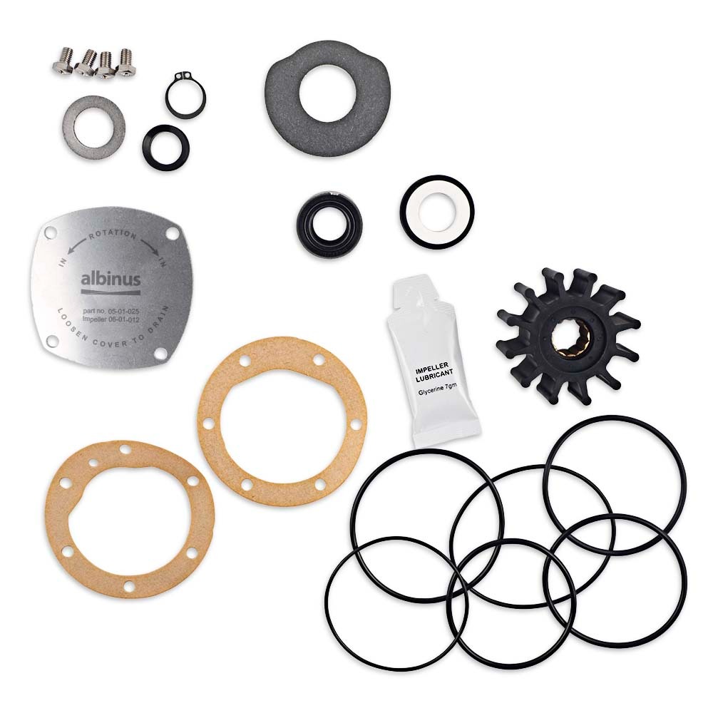 طقم صيانة لمضخة PN 05-01-025. يشمل طقم استبدال المروحة كما هو موضح في الصورة، وقطع الغيار، وأدوات التثبيت لمضخة FIP هذه.