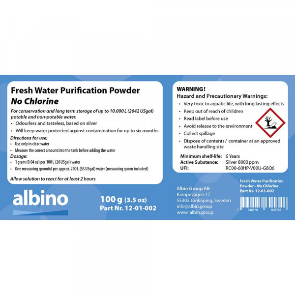 ١٠٠ غرام (٣.٥ أونصة) من مسحوق التنقية لحفظ وتخزين ما يصل إلى ١٠٠٠٠ لتر (٢٦٤٢ جالونًا أمريكيًا) من الماء الصالح للشرب وغير الصالح للشرب لفترة طويلة. • عديم الرائحة والطعم، مصنوع من الفضة. • يحافظ على الماء محميًا من التلوث لمدة تصل إلى ستة أشهر. طريقة الاستخدام: • يُستخدم فقط في الماء النقي. • قِس الكمية الصحيحة في الخزان قبل إضافة الماء. الجرعة: • غرام واحد (٠.٠٤ أونصة) لكل ١٠٠ لتر (٢٦ جالونًا أمريكيًا) من الماء. • ملعقة قياس واحدة لكل ٢٠٠ لتر تقريبًا (٥٣ جالونًا أمريكيًا) من الماء (ملعقة القياس مرفقة). اترك المحلول ليتفاعل لمدة ساعتين على الأقل. تحذير! •تحذيرات المخاطر والاحتياطات: • سام جدًا للحياة المائية، وله تأثيرات طويلة الأمد •يُحفظ بعيدًا عن متناول الأطفال •اقرأ الملصق قبل الاستخدام •تجنب إطلاقه في البيئة •اجمع الانسكابات •تخلص من المحتويات/العبوة في موقع معتمد لمعالجة النفايات الحد الأدنى لعمر التخزين: 6 سنوات المادة الفعالة: الفضة 8000 جزء في المليون UFI:RC00-60HP-V00U-G8Q6