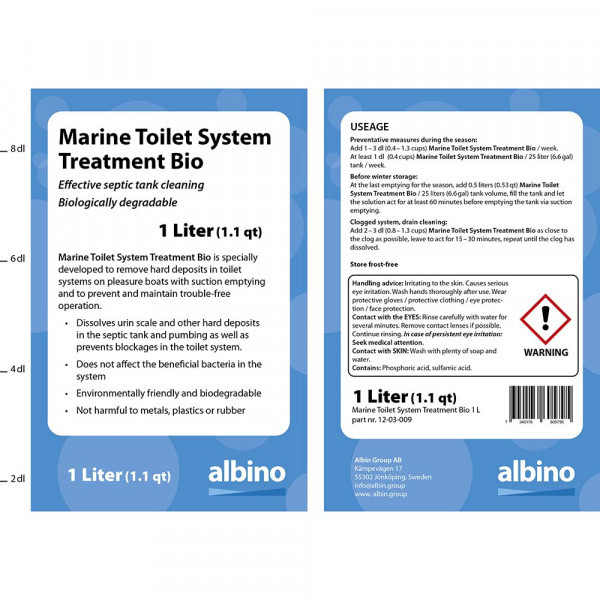 تنظيف فعال لخزان الصرف الصحي، قابل للتحلل البيولوجي. سعة 1 لتر (1.1 كوارت). تم تطوير Marine Toilet System Treatment Bio خصيصًا لإزالة الرواسب الصلبة في أنظمة المراحيض على متن قوارب النزهة مع الإزالة بالشفط ولمنع التشغيل والحفاظ عليه بدون مشاكل. • يذيب رواسب البول والرواسب الصلبة الأخرى في خزان الصرف الصحي والمضخات بالإضافة إلى منع الانسدادات في نظام المرحاض. • لا يؤثر على البكتيريا المفيدة في النظام • صديق للبيئة وقابل للتحلل البيولوجي • غير ضار بالمعادن أو البلاستيك أو المطاط الاستخدام التدابير الوقائية خلال الموسم: أضف 1-3 ديسيلتر (0.4-1.3 كوب) من Marine Toilet System Treatment Bio / أسبوع. ما لا يقل عن 1 ديسيلتر (0.4 كوب) من Marine Toilet System Treatment Bio / خزان سعة 25 لترًا (6.6 جالون) / أسبوع. قبل التخزين الشتوي: عند آخر إفراغ للموسم، أضف 0.5 لتر (0.53 كوارت) من محلول معالجة نظام المرحاض البحري الحيوي / سعة خزان 25 لترًا (6.6 جالون)، املأ الخزان واترك المحلول يعمل لمدة 60 دقيقة على الأقل قبل إفراغ الخزان عن طريق تفريغ الشفط. انسداد النظام، تنظيف المصرف: أضف 2-3 ديسيلتر (0.8-1.3 كوب) من محلول معالجة نظام المرحاض البحري الحيوي بالقرب من الانسداد قدر الإمكان، واتركه يعمل لمدة 15-30 دقيقة، وكرر ذلك حتى يذوب الانسداد. يُحفظ بعيدًا عن الصقيع تحذير نصائح التعامل: مهيج للجلد. يسبب تهيجًا خطيرًا للعين. اغسل يديك جيدًا بعد الاستخدام. ارتدِ قفازات واقية / ملابس واقية / واقي للعين / واقي للوجه. ملامسة العينين: اشطف جيدًا بالماء لعدة دقائق. أزل العدسات اللاصقة إذا أمكن. استمر في الشطف. في حالة استمرار تهيج العين: اطلب العناية الطبية. ملامسة الجلد: اغسل جيدًا بالماء والصابون. يحتوي على: حمض الفوسفوريك، وحمض السلفاميك.