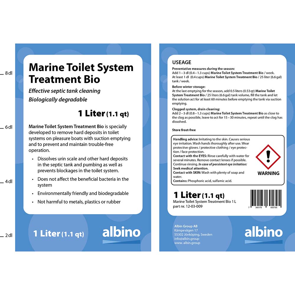 تنظيف فعال لخزان الصرف الصحي، قابل للتحلل البيولوجي. سعة 1 لتر (1.1 كوارت). تم تطوير Marine Toilet System Treatment Bio خصيصًا لإزالة الرواسب الصلبة في أنظمة المراحيض على متن قوارب النزهة مع الإزالة بالشفط ولمنع التشغيل والحفاظ عليه بدون مشاكل. • يذيب رواسب البول والرواسب الصلبة الأخرى في خزان الصرف الصحي والمضخات بالإضافة إلى منع الانسدادات في نظام المرحاض. • لا يؤثر على البكتيريا المفيدة في النظام • صديق للبيئة وقابل للتحلل البيولوجي • غير ضار بالمعادن أو البلاستيك أو المطاط الاستخدام التدابير الوقائية خلال الموسم: أضف 1-3 ديسيلتر (0.4-1.3 كوب) من Marine Toilet System Treatment Bio / أسبوع. ما لا يقل عن 1 ديسيلتر (0.4 كوب) من Marine Toilet System Treatment Bio / خزان سعة 25 لترًا (6.6 جالون) / أسبوع. قبل التخزين الشتوي: عند آخر إفراغ للموسم، أضف 0.5 لتر (0.53 كوارت) من محلول معالجة نظام المرحاض البحري الحيوي / سعة خزان 25 لترًا (6.6 جالون)، املأ الخزان واترك المحلول يعمل لمدة 60 دقيقة على الأقل قبل إفراغ الخزان عن طريق تفريغ الشفط. انسداد النظام، تنظيف المصرف: أضف 2-3 ديسيلتر (0.8-1.3 كوب) من محلول معالجة نظام المرحاض البحري الحيوي بالقرب من الانسداد قدر الإمكان، واتركه يعمل لمدة 15-30 دقيقة، وكرر ذلك حتى يذوب الانسداد. يُحفظ بعيدًا عن الصقيع تحذير نصائح التعامل: مهيج للجلد. يسبب تهيجًا خطيرًا للعين. اغسل يديك جيدًا بعد الاستخدام. ارتدِ قفازات واقية / ملابس واقية / واقي للعين / واقي للوجه. ملامسة العينين: اشطف جيدًا بالماء لعدة دقائق. أزل العدسات اللاصقة إذا أمكن. استمر في الشطف. في حالة استمرار تهيج العين: اطلب العناية الطبية. ملامسة الجلد: اغسل جيدًا بالماء والصابون. يحتوي على: حمض الفوسفوريك، وحمض السلفاميك.