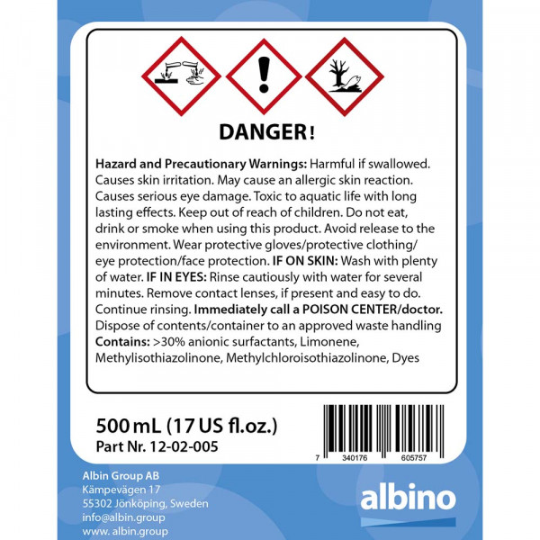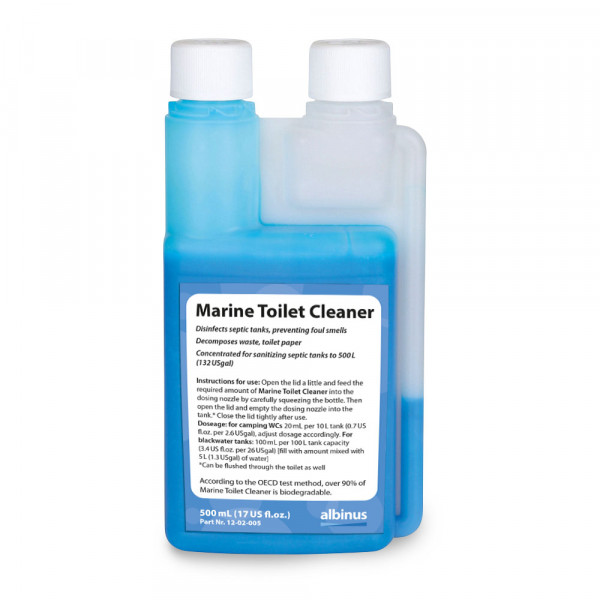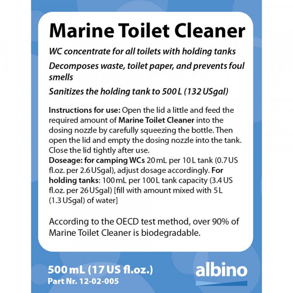 ٥٠٠ مل (١٧ أونصة سائلة أمريكية) من مُركّز مُنظّف المرحاض لجميع المراحيض المُزوّدة بخزانات. يُحلّل النفايات وورق التواليت، ويمنع الروائح الكريهة. يُعقّم خزان المرحاض حتى ٥٠٠ لتر (١٣٢ جالونًا أمريكيًا). تعليمات الاستخدام: افتح الغطاء قليلًا وضع الكمية المطلوبة من مُنظّف المرحاض البحري في فوهة الجرعات بالضغط برفق على الزجاجة. ثم افتح الغطاء وأفرغ فوهة الجرعات في الخزان. أغلق الغطاء بإحكام بعد الاستخدام. الجرعة: لمراحيض التخييم: ٢٠ مل لكل خزان سعة ١٠ لترات (٠.٧ أونصة سائلة أمريكية لكل ٢.٦ جالونًا أمريكيًا)، اضبط الجرعة وفقًا لذلك. لخزانات التخزين: 100 مل لكل 100 لتر من سعة الخزان (3.4 أونصة سائلة أمريكية لكل 26 جالونًا أمريكيًا) [املأ الكمية المخلوطة بـ 5 لترات (1.3 جالونًا أمريكيًا) من الماء]. وفقًا لطريقة اختبار منظمة التعاون الاقتصادي والتنمية، فإن أكثر من 90% من منظف المراحيض البحرية قابل للتحلل البيولوجي. تحذيرات المخاطر والاحتياطات: ضار في حالة الابتلاع. يسبب تهيج الجلد. قد يسبب رد فعل تحسسي للجلد. يسبب تلفًا خطيرًا للعين. سام للحياة المائية مع تأثيرات طويلة الأمد. يُحفظ بعيدًا عن متناول الأطفال. لا تأكل أو تشرب أو تدخن عند استخدام هذا المنتج. تجنب إطلاقه في البيئة. ارتدِ قفازات واقية/ملابس واقية/واقي للعين/واقي للوجه. في حالة ملامسة الجلد: اغسل بالكثير من الماء. في حالة ملامسة العينين: اشطف بحذر بالماء لعدة دقائق. أزل العدسات اللاصقة، إذا كانت موجودة ويسهل إزالتها. استمر في الشطف. اتصل فورًا بمركز السموم/الطبيب. تخلص من المحتويات/العبوة في مكان معتمد لمعالجة النفايات. يحتوي على: أكثر من 30% من المواد الفعالة بالسطح الأنيونية، ليمونين، ميثيل إيزوثيازولينون، ميثيل كلورو إيزوثيازولينون، أصباغ.